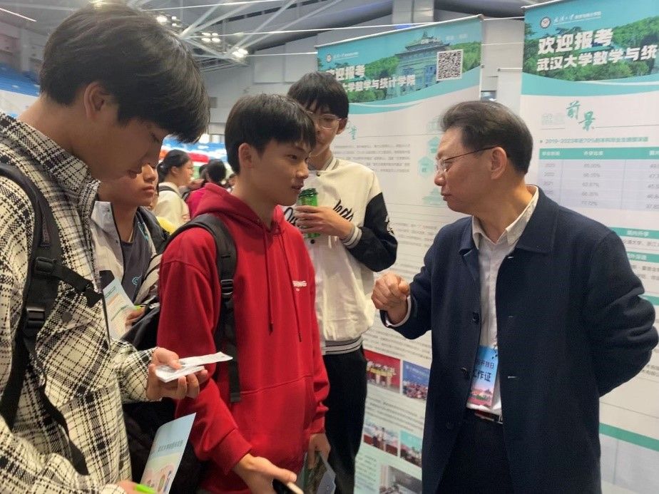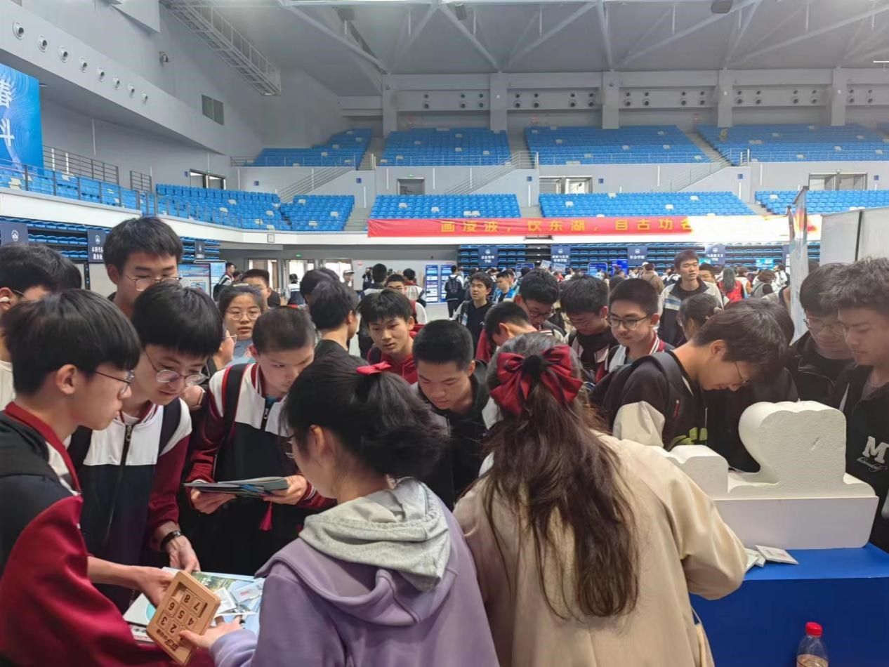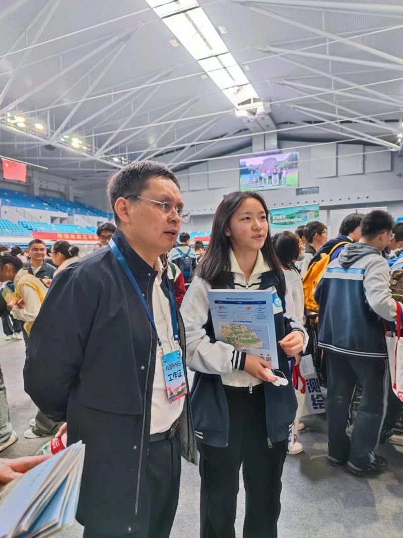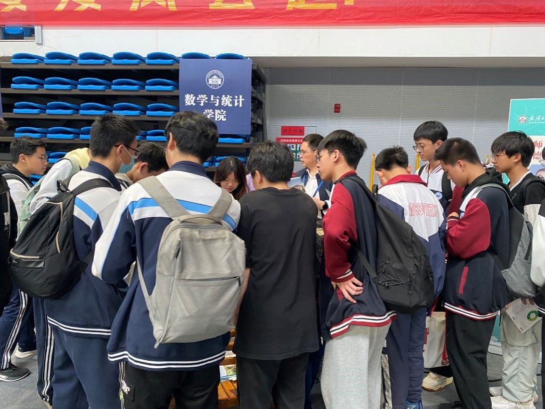展位前为高中生答疑解惑,发放宣传资料。针对高中生和家长提出的招生政策、专业设置及培养模式等问题,逐一热情回答。学生志愿者设计的数学小游戏,吸引众多高中生前来参与,体验数学的魅力。