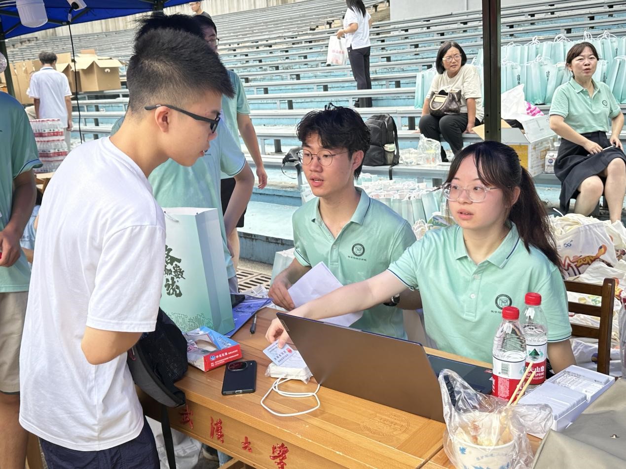 迎新志愿者们统一身着绿色上衣,手持学院指示牌,引导新生们进行身份验证,完成报到注册,领取新生礼包。在成人直播