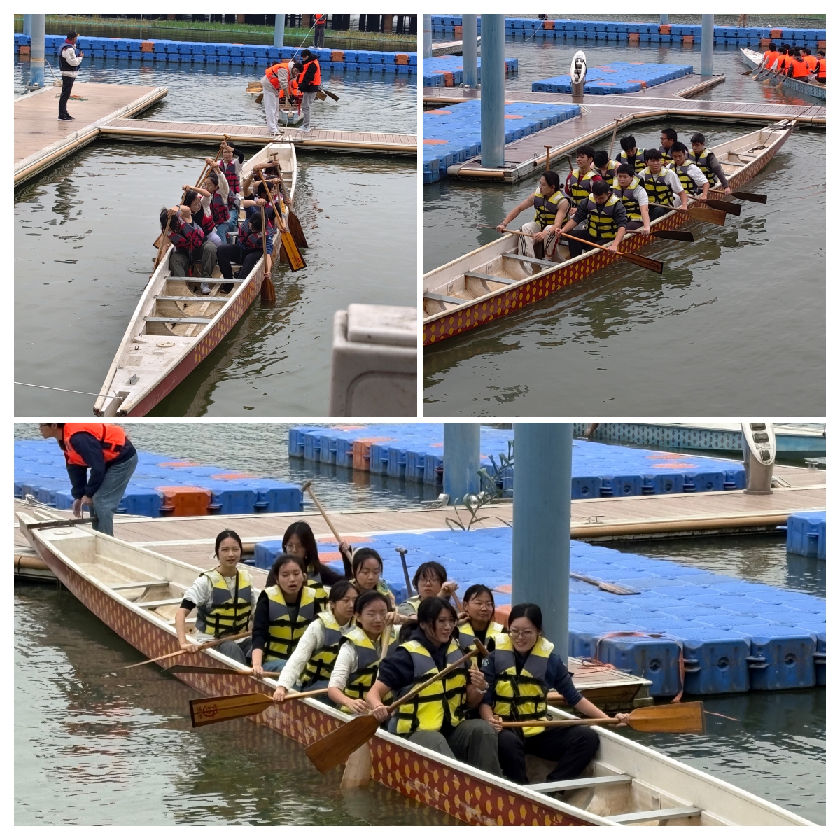 代表队进行了紧锣密鼓的训练。手臂的酸痛,腰背的紧绷,无不诉说着训练的辛苦。一次次的奋力划动,一次次的节奏改变,工学部训练室水面上的波纹,夹杂着他们的汗水,荡出了东湖上四溅的浪花。尽管队里几乎没有校龙舟队的队员,但队员们为了团队的荣誉克服重重困难,不管面对多么强大的对手都不轻言放弃。他们齐心协力,拼尽全力,取得了一场又一场的胜利。