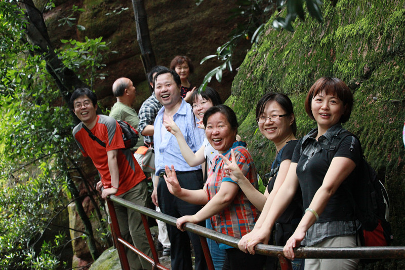 5月12日,旅行团到达龙虎山景区,恰逢大雨,但大家游兴不减,兴致勃勃地乘坐竹筏漂流仙水岩景区,观看悬棺表演,参观道教祖庭—天师府、道教发祥地---大上清宫。