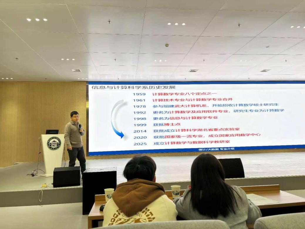 戴书洋介绍了计算数学的历史发展,通过对比信息与计算科学专业及数据科学与大数据专业的核心课程和研究方向,提醒同学们根据个人兴趣、能力特质、发展方向进行专业选择。