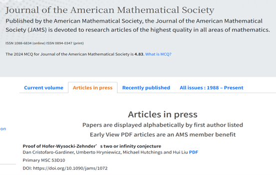 近日,《美国数学会杂志》(Journal of the American Mathematical Society)在线发表了成人直播 刘会教授与合作者的最新研究成果。该论文成功证明了关于Hofer-Wysocki-Zehnder的二或无穷条周期轨道猜想和Bangert-龙以明的二或无穷条闭测地线猜想。