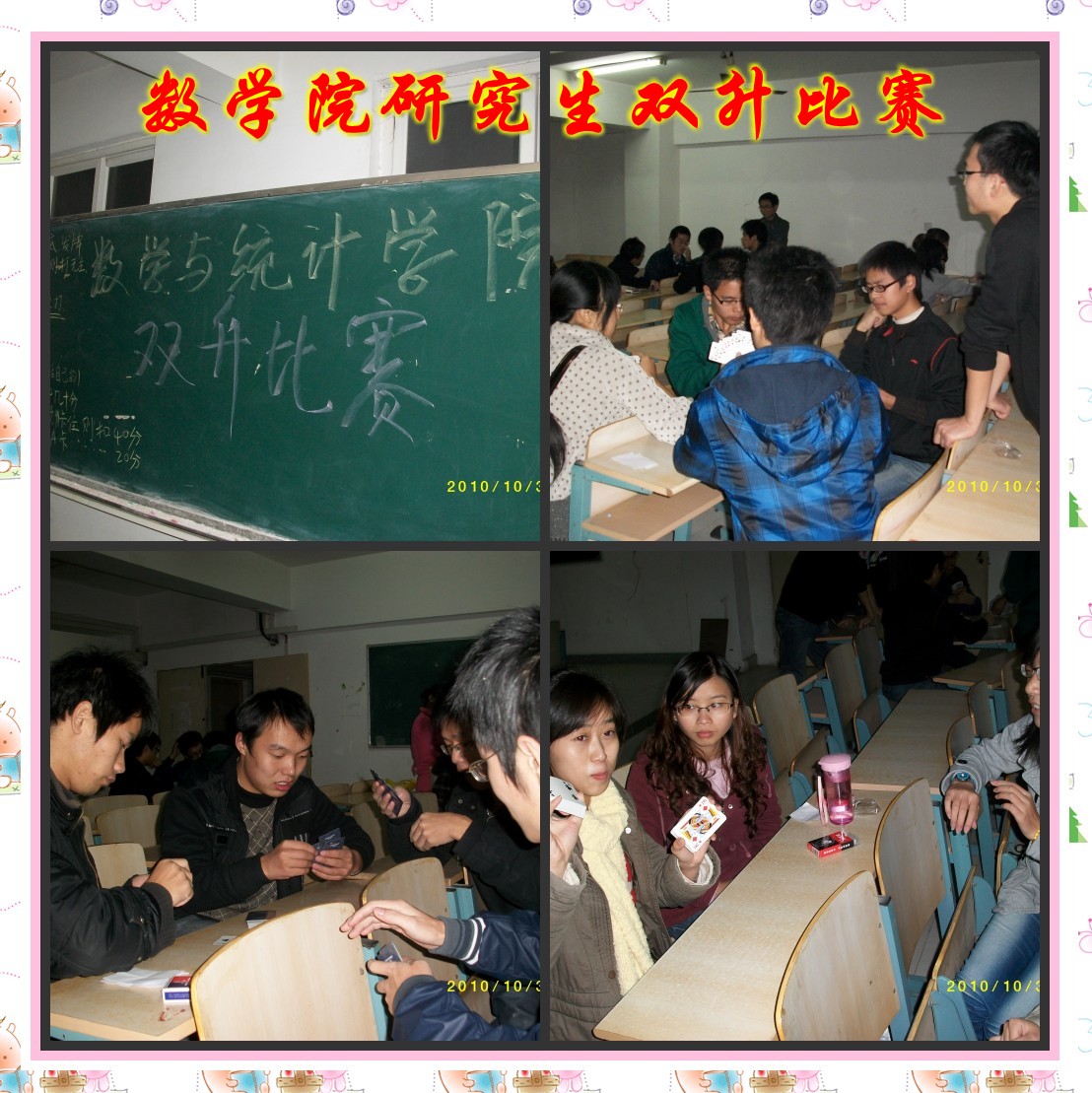 10月29日晚,弘博研究生公寓六楼自习室,扑克牌双升比赛正在火热进行。院研究生会体育部为本次活动进行了精心准备和充分的宣传。2010级各硕士班级分别派出了代表队参赛。比赛中,有默契的配合,有失误的自责;有牌不好时的无赖,也有赢牌后的欣喜若狂。场面热烈,气氛融洽。最后应用数学代表队积分最高获得第一名。
