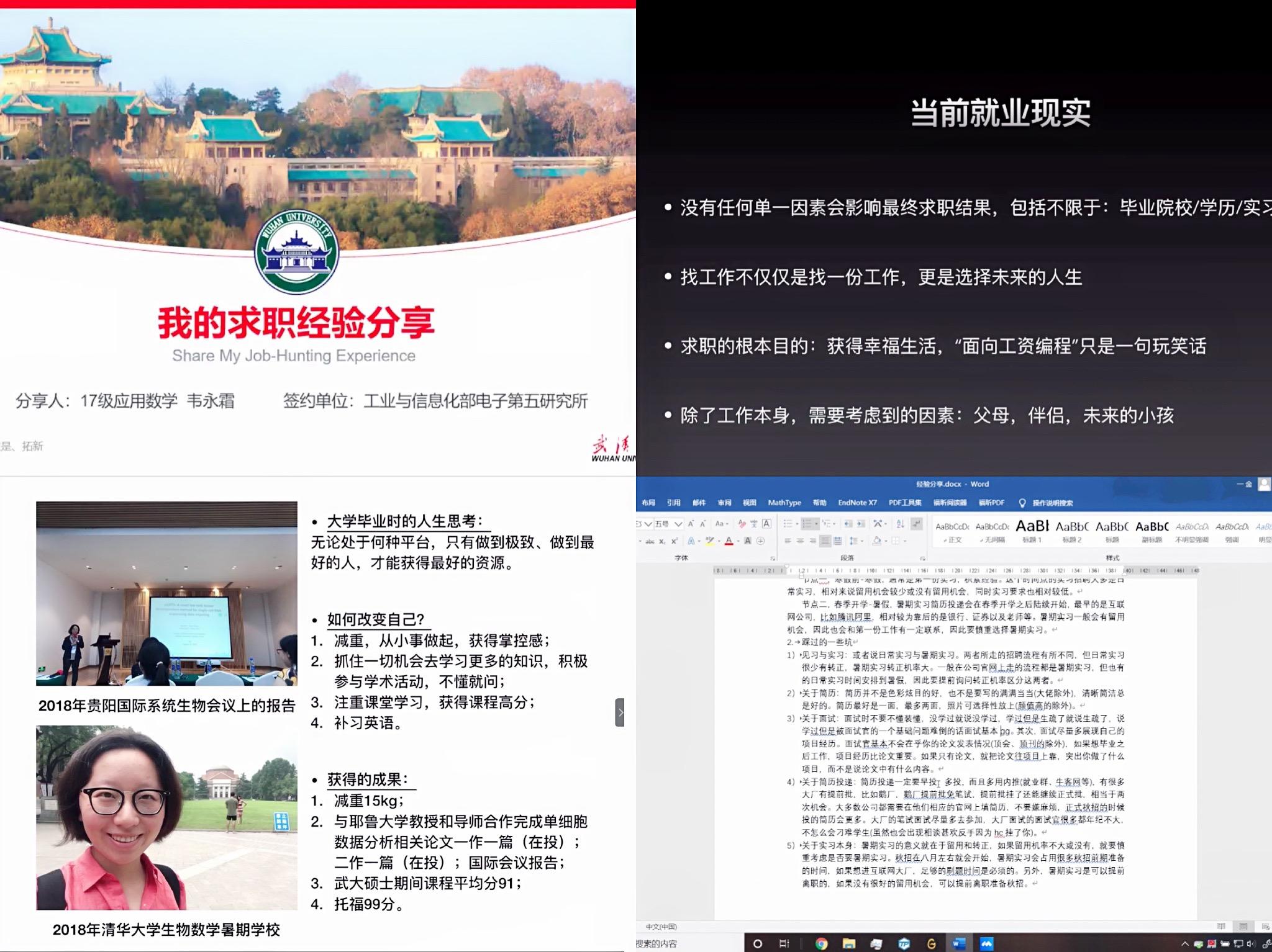 第四位同学是来自于计算数学的敬康宏,他即将就职于华为技术有限公司。学长告诫我们在求职过程中一定要重视时间节点,讲解了见习与实习的区别,同时讲述了他在简历、面试、简历投递、实习本身等方面走过的弯路,提醒学弟学妹要注意。