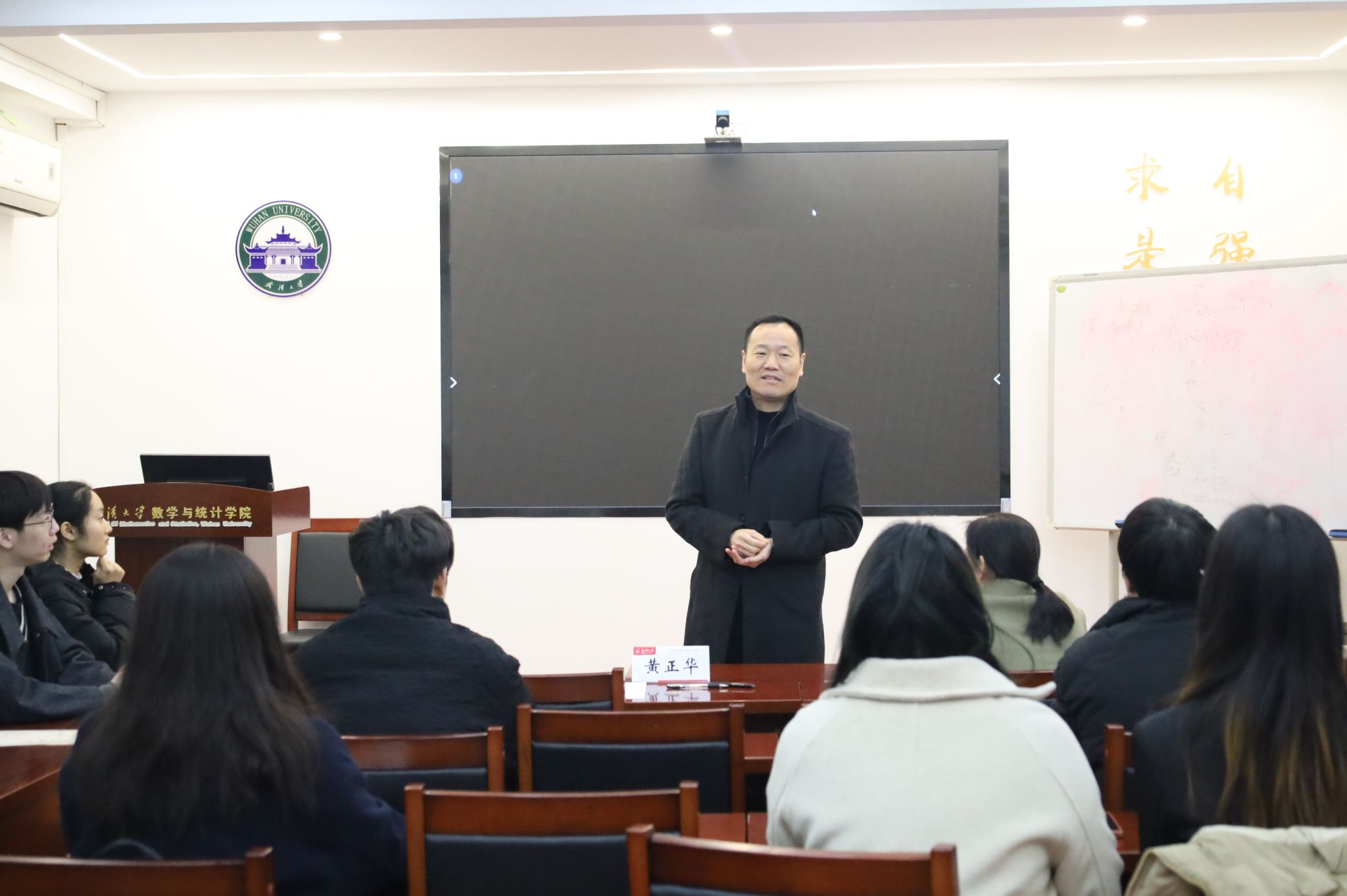 黄正华老师在致辞中充分肯定了研究生数学讲课比赛的重要意义,并为有志从事教育教学的研究生提出了三点建议:一是积极探索,大胆创新;二是以赛促学,以学促用;三是立德树人,培根铸魂。最后,他表达了对参赛选手们的期待,希望选手们在比赛中享受舞台,赛出成绩和风采。