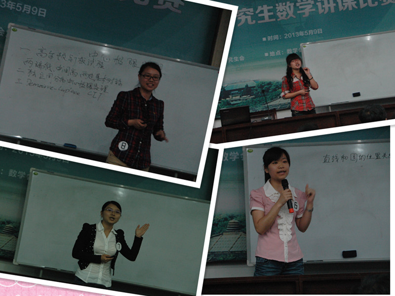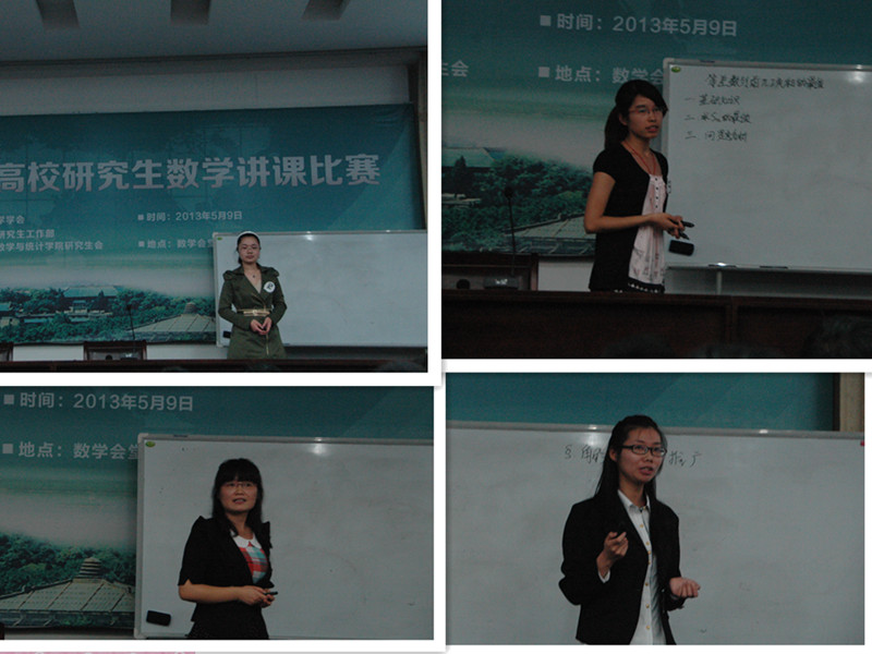 2013年5月9日晚上6:00,第八届湖北省高校研究生数学讲课比赛在数学会堂火热进行。本次比赛由湖北省数学学会、成人直播 党委研究生工作部主办,成人直播 承办。来自成人直播 、中科院物理与数学研究所、华中科技大学、华中师范大学、湖北大学以及武汉理工大学六所高校的十二名精英选手,经过初赛的严格选拔,在数学会堂再度交锋,上演了一场精彩绝伦的讲课技能交流大赛。