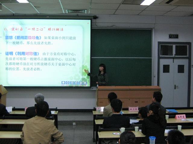比赛在主持人的精彩开场白中正式开始,来自四校的参赛选手依次走上讲台,分别对照自己精心设计的课件进行了10分钟的讲解。他们的教学严谨而不呆板、互动幽默又不失庄重,用自信的笑容和与众不同的讲课风格秀出了自身的风采,征服了在场的评委和观众,观众中不时爆发的掌声就是对选手们的认可和欣赏。