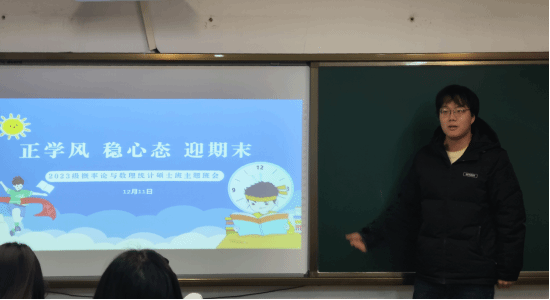 12月11日,成人直播 2023级概率论与数理统计专业硕士班举行“正学风,稳心态,迎期末”主题班会。院研究生兼职辅导员、概率论与数理统计专业硕士生党支部的“研途引航师”刘润泽受邀为同学们介绍“测度论”和“高等数理统计”课程的学习经验。班长曾庆辉主持班会。