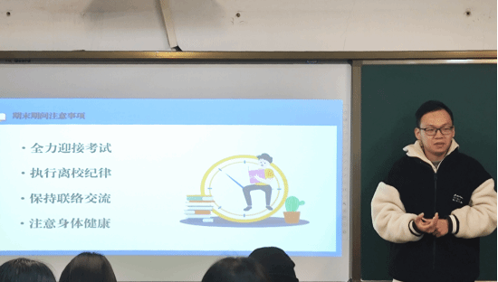 经验分享结束后,刘润泽强调了期末期间的注意事项。一是全力迎接考试,遵守考试纪律,争取考出理想成绩。二是执行离校纪律,考试结束离校要给学院和导师报备。三是保持联络交流,定期和导师汇报科研进展,遇到问题及时跟班级和学院沟通。四是注意身体健康,及时添加衣服,身体不适及时就医。