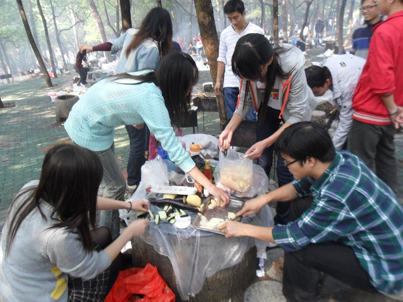 九点左右我们到达目的地——森林公园烧烤区,此时烧烤区已经人满为患,热闹非常。来不及停歇片刻,女生们齐刷刷开始摘菜、切菜、洗菜、穿串,男生们则点燃炉子,将火候调到烧烤的最佳状态。一会儿功夫,大家都吃到了香喷喷的烤鸡翅、烤鸡腿、烤火腿、烤土豆。