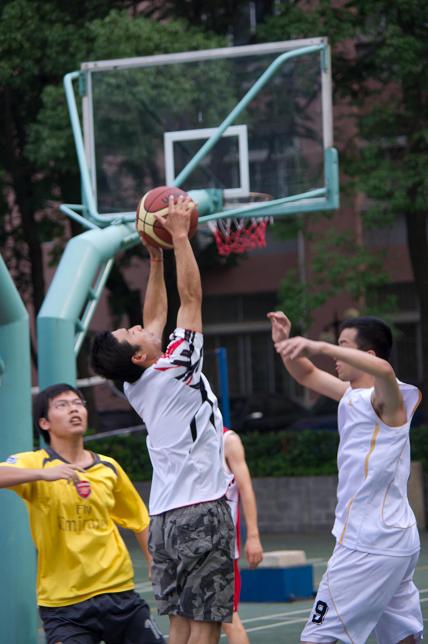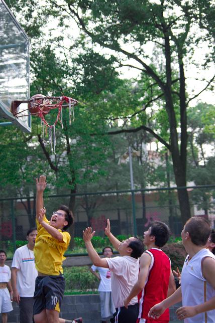 3:30分,裁判的一声哨响,比赛开始了。刚开始,可能由于身高方面的劣势研究生们被对方领先了6分。这时拉拉队在班长的带领下,“数院,加油!”之声在篮球场上响起。球员们受此鼓舞连追4球,上半场以14:18结束。下半场研究生们继续积极进攻,威猛的拉拉队也继续为他们呐喊助威,最后以30:32的微弱差距结束了比赛。
