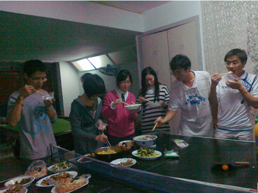 大概4点半的时候,“大厨们”开始做菜了。首先炖上了玉米排骨,煮上了草鱼。做其他菜的“厨师”们也热火朝天地忙开了:调配料,切菜,配菜……瞧,那是罗同学在炒菜呢,她一边看菜谱一边掌勺,油开了,“快快,花椒花椒……”左边的同学立马递上花椒,“青豆青豆!”配好的青豆又送上,终于,一盘宫保虾球起锅了,小武同学头一个拿起筷子尝了尝:“嗯,不错哟!”……就这样,一盘又一盘同学们精心准备的菜端上了餐桌:红烧鸡翅,肉末茄子,毛豆肉丝,咖喱牛肉,干煸大头菜,宫保豆腐,番茄鸡蛋,炒西兰花,清炒小白菜……虽然没有专业级别的水准,但同学们还是吃得很享受,可能是因为每盘菜都是大家自己的心血吧。