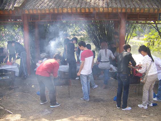 在森林公园的烧烤区,同学们在长廊下占据了一块宝地,起炉生火,烤起了可口的美味。尽管烟熏火烤,弄得大家泪水、汗水夹击,但仍乐此不疲。