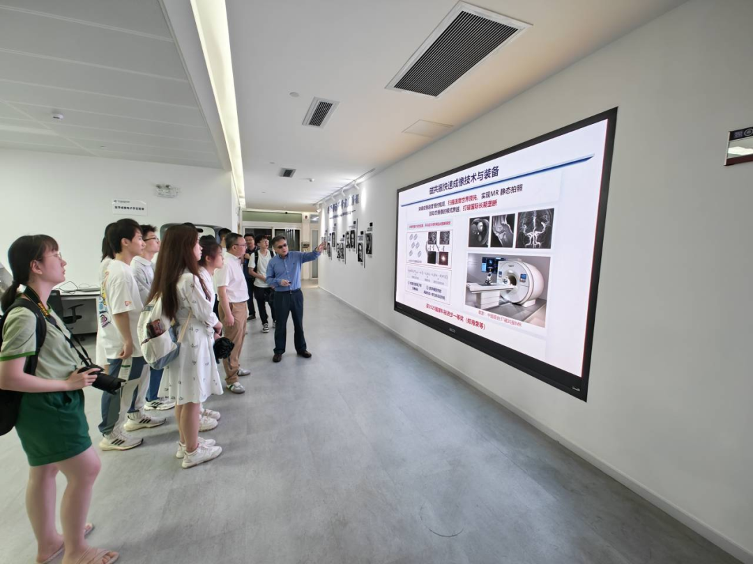 多名博士毕业生就职于先进院。队伍一行首先参观了先进院劳特伯生物医学成像研究中心,刘主任为师生们详细解说了医学影像科学的发展历程,以及中心技术创新与产业转化的诸多成果。在这里,我们看到了由中心提出的磁共振快速成像技术与装备,该设备荣获了国家科技进步奖一等奖,达到世界领先的扫描速度,打破了国际长期的欧美垄断,其核心正是数学模型先验和傅里叶变换等数学原理,这让同学们深深感受到数学对于先进技术研究的重要性。