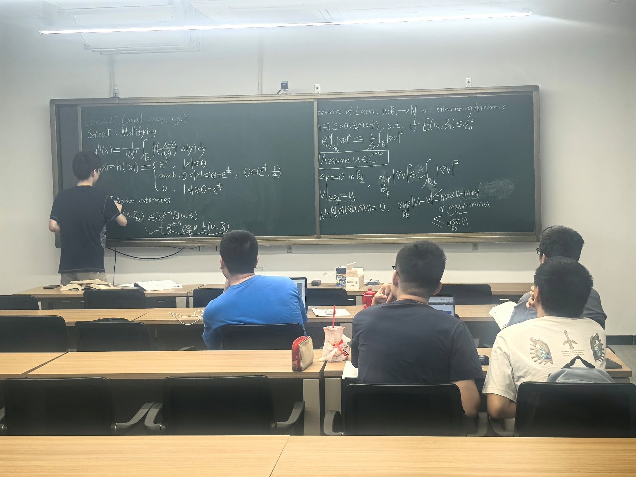 The second seminar was jointly presented by Zhu Rui and Chen Yiming (Class of 2022, Mathematics and Applied Mathematics, Ziqiang Class). Their talk focused on the regularity and singular set of energy-minimizing harmonic maps. They systematically studied the regularity theory of energy-minimizing harmonic maps, including smoothness in two dimensions (the classical result by Morrey in 1948) and partial regularity in higher dimensions (the Schoen–Uhlenbeck theory). They also examined dimensional estimates and compactness theorems for singular sets in general dimensions. Through in-depth study of these frontier theories, students not only mastered core research methods in harmonic map theory but also gained a deep appreciation for the distinctive appeal and vitality of modern geometric analysis.