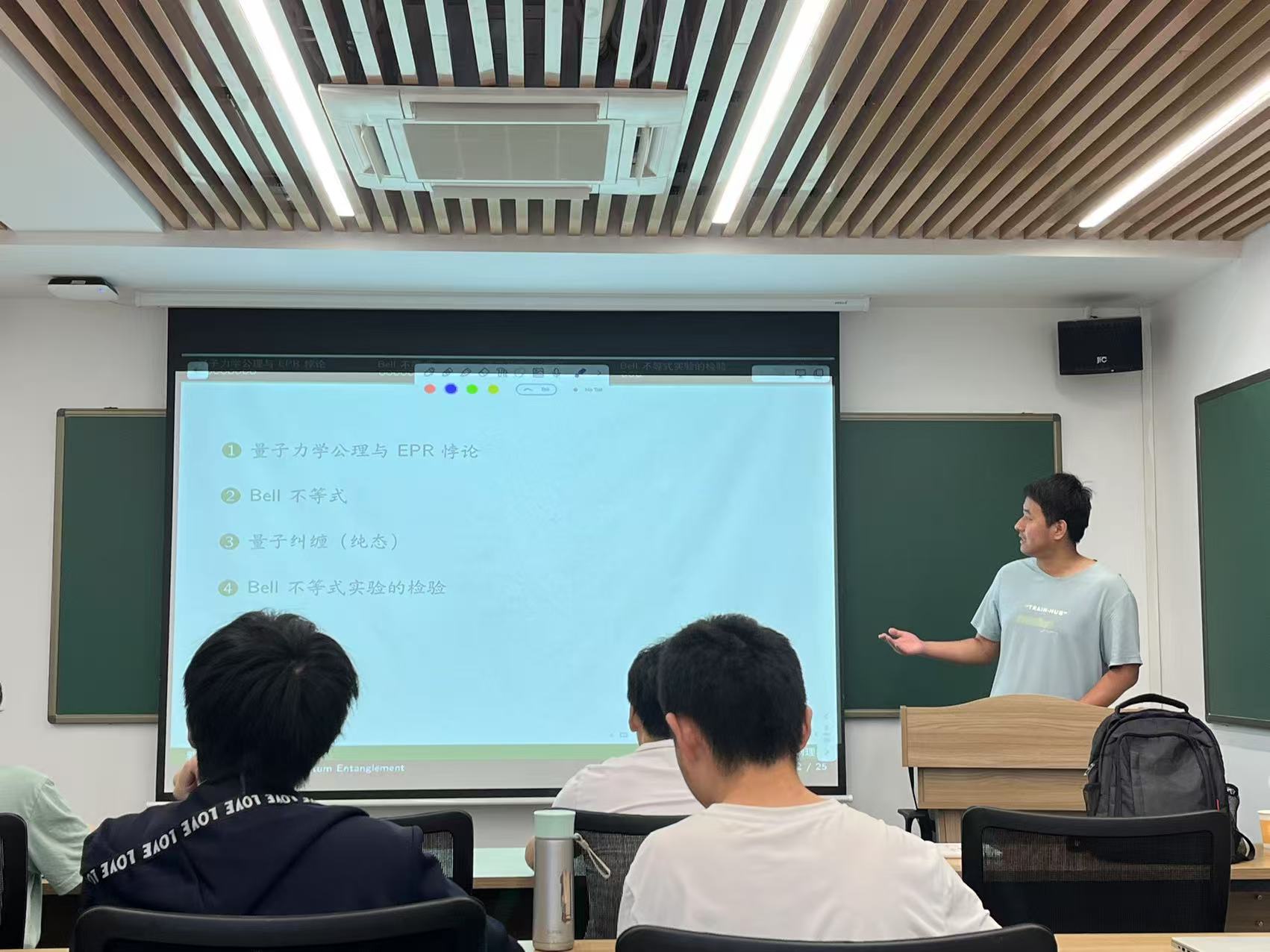 In the second seminar, Guo Jingyu, a 2022 physics major, delivered a talk titled “Bell’s Inequality and Quantum Entanglement,” offering an in-depth introduction to the fundamental postulates of quantum mechanics, the EPR paradox, Bell’s inequalities and their experimental verification, and the empirical tests of quantum entanglement. He first revisited the core axioms of quantum mechanics and analyzed the physical essence of the EPR paradox, explaining its challenge to the completeness of quantum theory. He then focused on Bell’s theorem, particularly the derivation of the CHSH inequality, and elaborated on the fundamental distinctions between classical theory and quantum mechanics in terms of correlations. Guo also rigorously distinguished, in mathematical form, between pure, separable, and entangled states, using Bell states as examples to demonstrate the nonlocal correlation properties of entangled states. Through this seminar, students gained a deeper understanding of the quantum information field—especially a clearer recognition of the essential differences between quantum mechanics and classical theories—and came to appreciate that quantum entanglement, as a phenomenon beyond classical intuition, serves as a core driving force for the development of quantum information science.